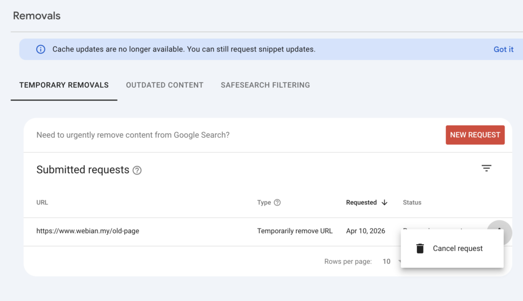 提交完成后,你可以在历史记录里看到你所有的移除请求和它们的处理状态。如果你后悔了或者不小心提交了错误的 URL,也可以在这里找到那个请求,点击旁边的菜单按钮选择 “Cancel Request” 来撤销哦。(如下图)