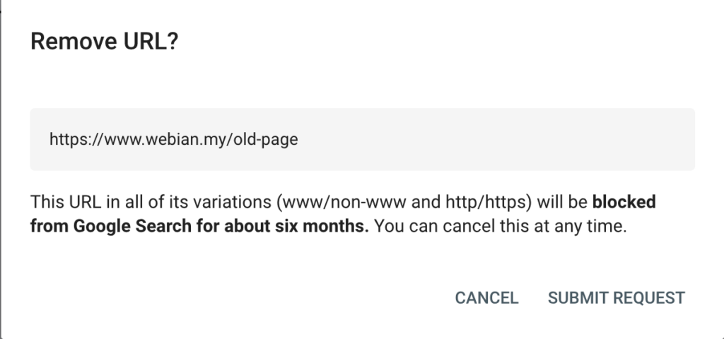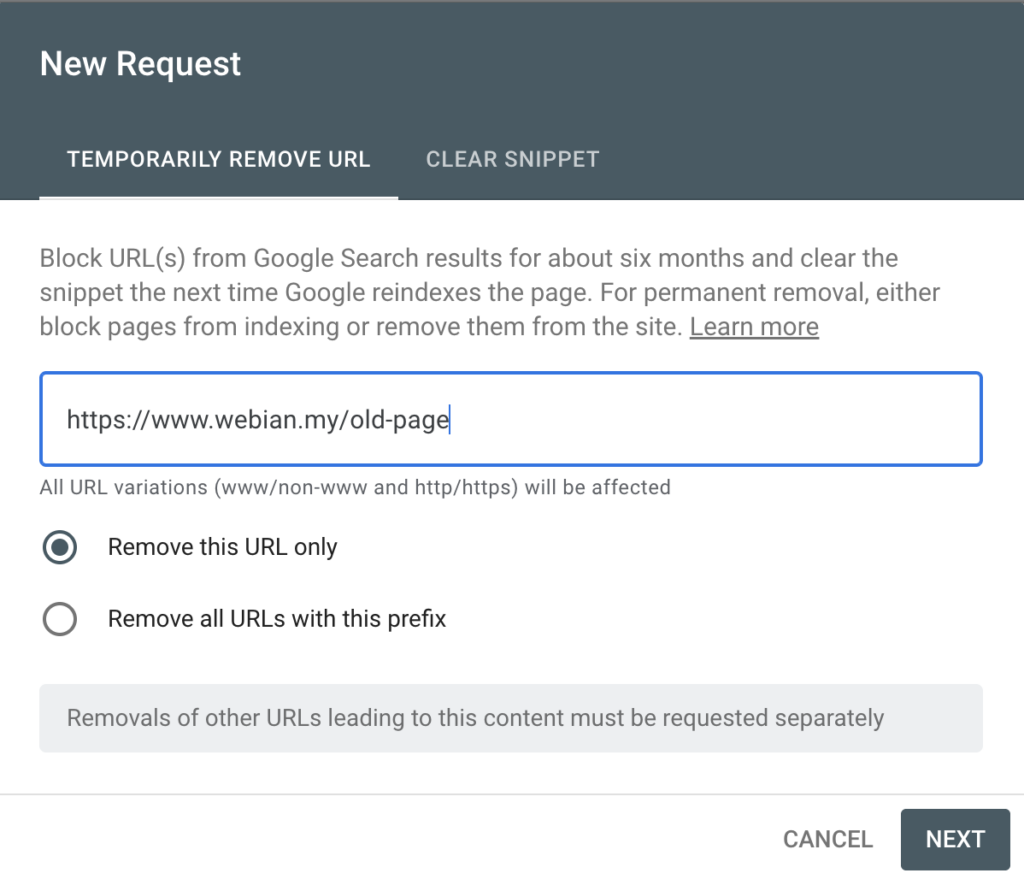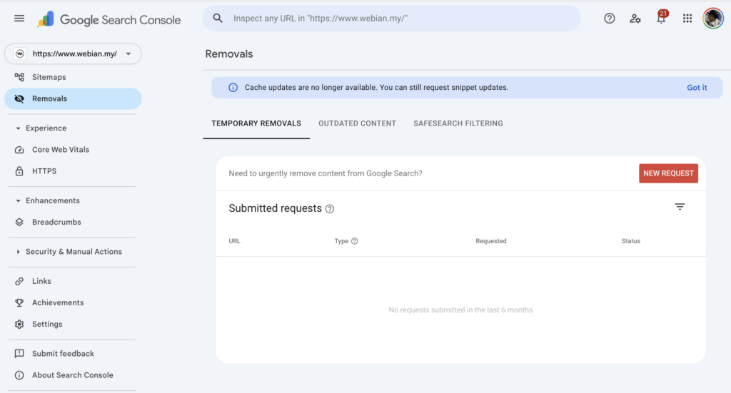 进入移除工具的页面后,点击 “新请求” 的按钮,然后输入你要移除的完整 URL,比如 “https://www.webian.my/old-page”。(如下图)